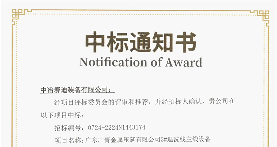 7月25日,中冶賽迪裝備接到廣青金屬壓延有限公司中標通知書,由賽迪股份、賽迪裝備共同開拓的廣東廣青金屬壓延3#不銹鋼退火酸洗主線設(shè)備成套項目成功中標。